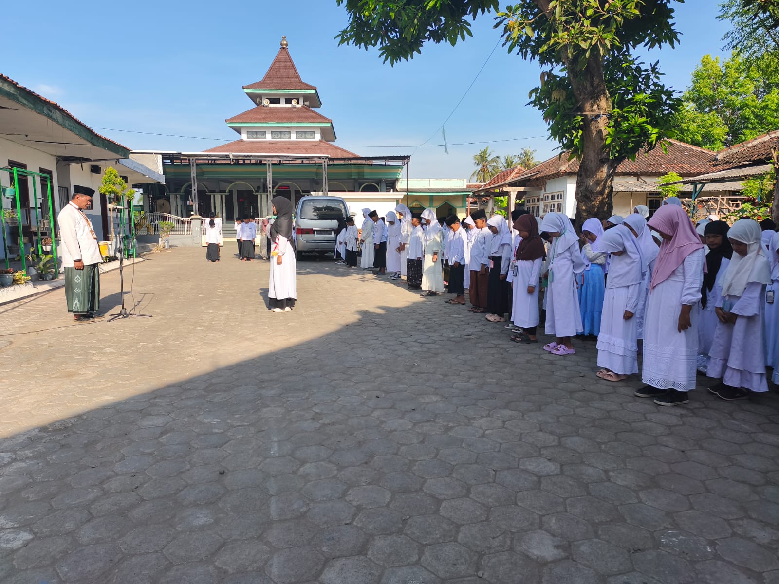 Pada hari Rabu, 22 Oktober 2025, MI Darul Ulum II Tembokrejo melaksanakan upacara peringatan **Hari Santri Nasional** dengan penuh khidmat dan semangat kebangsaan. Upacara ini diikuti oleh seluruh dewan guru, tenaga kependidikan, serta seluruh siswa-siswi dari kelas I hingga kelas VI. Sejak pagi, halaman madrasah sudah dipenuhi peserta upacara yang mengenakan busana khas santri—siswa putra mengenakan sarung, baju putih, dan peci hitam, sedangkan siswa putri memakai busana muslimah dengan kerudung putih yang seragam, menampilkan suasana religius dan penuh kekompakan.
